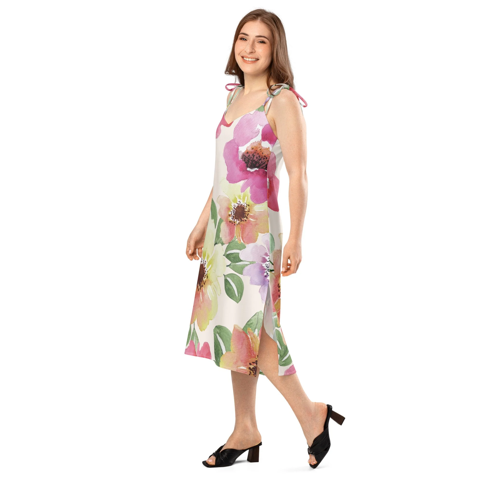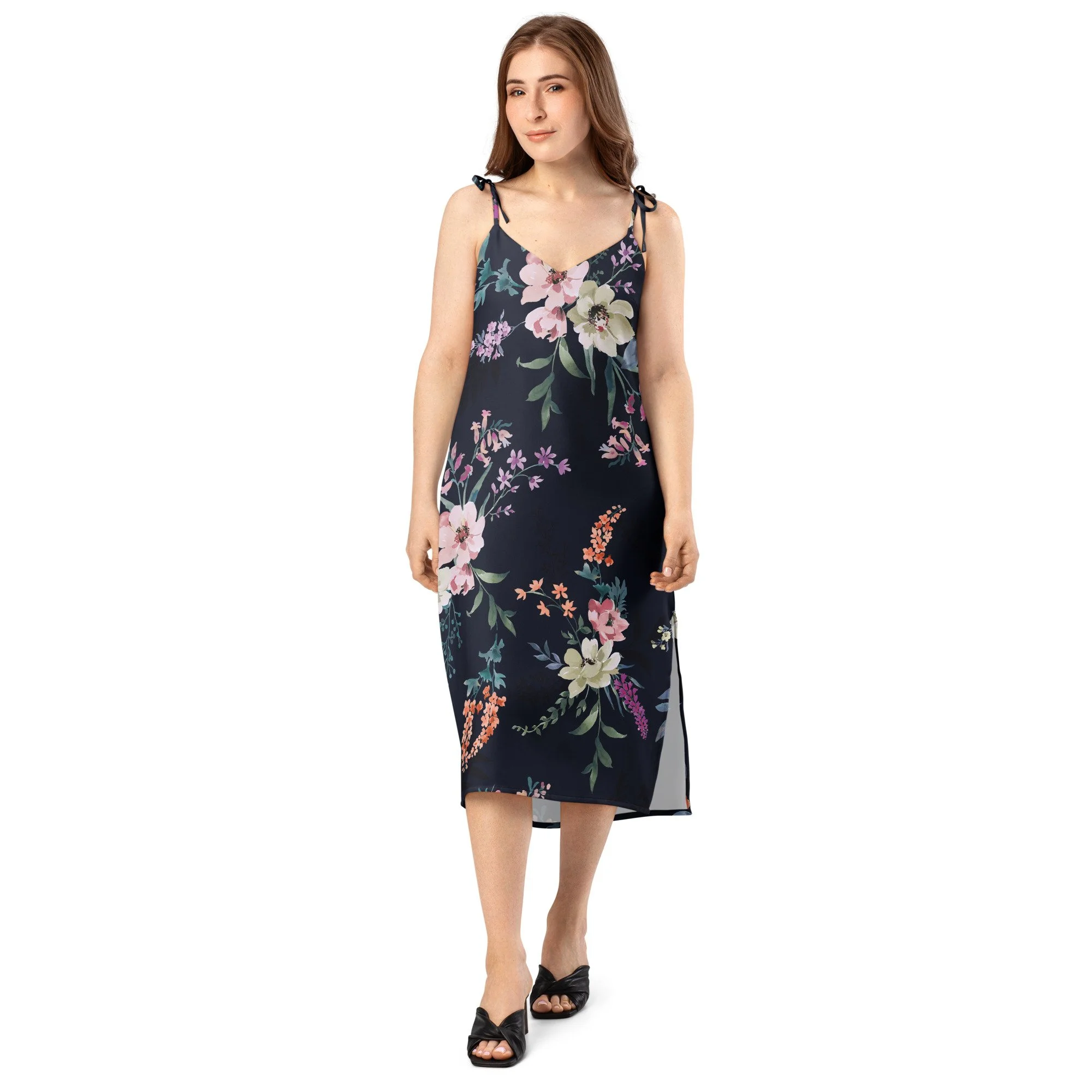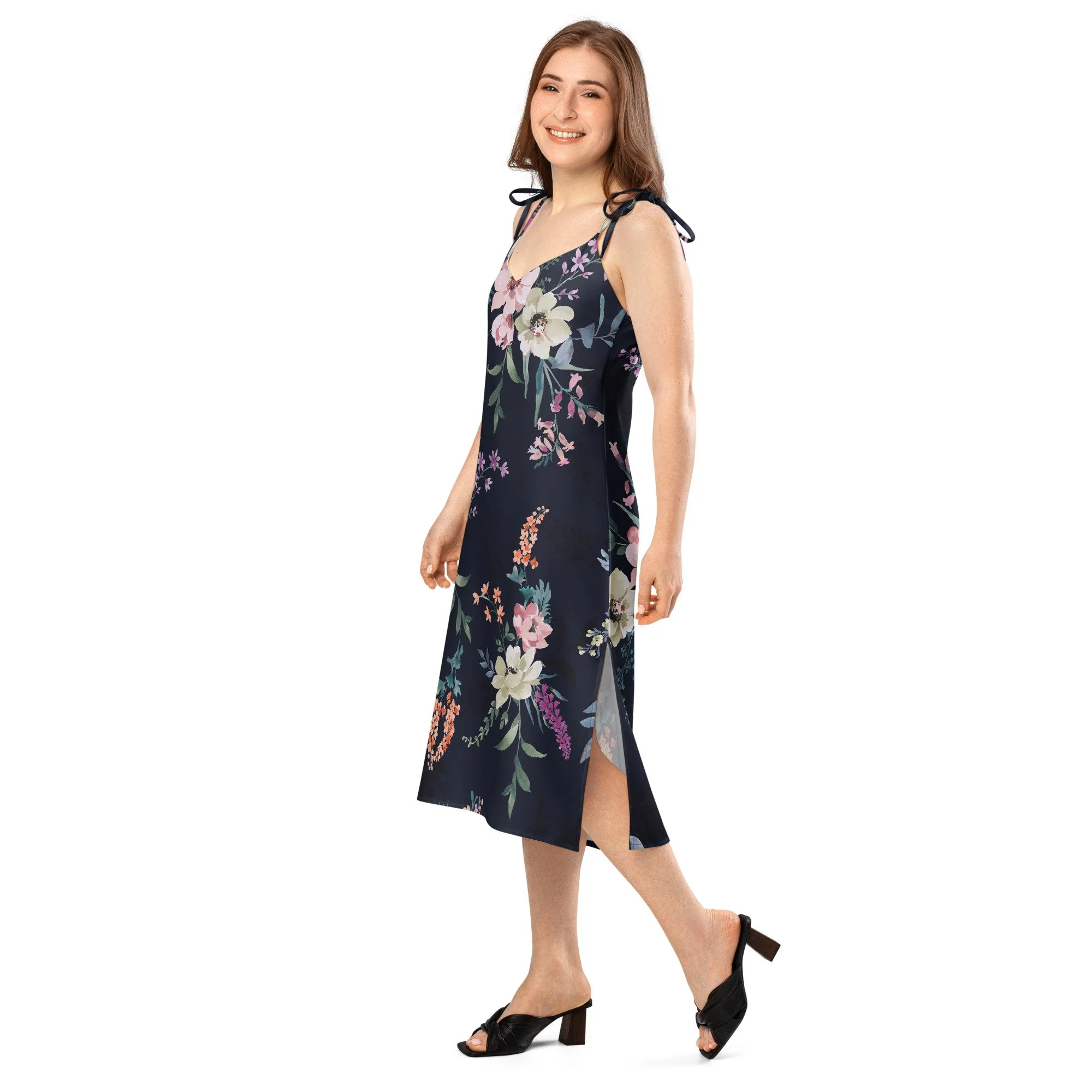 Floaty, flirty, and totally flattering—from daytime garden parties to dinner dates. This midi dress features a breezy side slit, adjustable tie straps, and a built-in bra for no-fuss style.