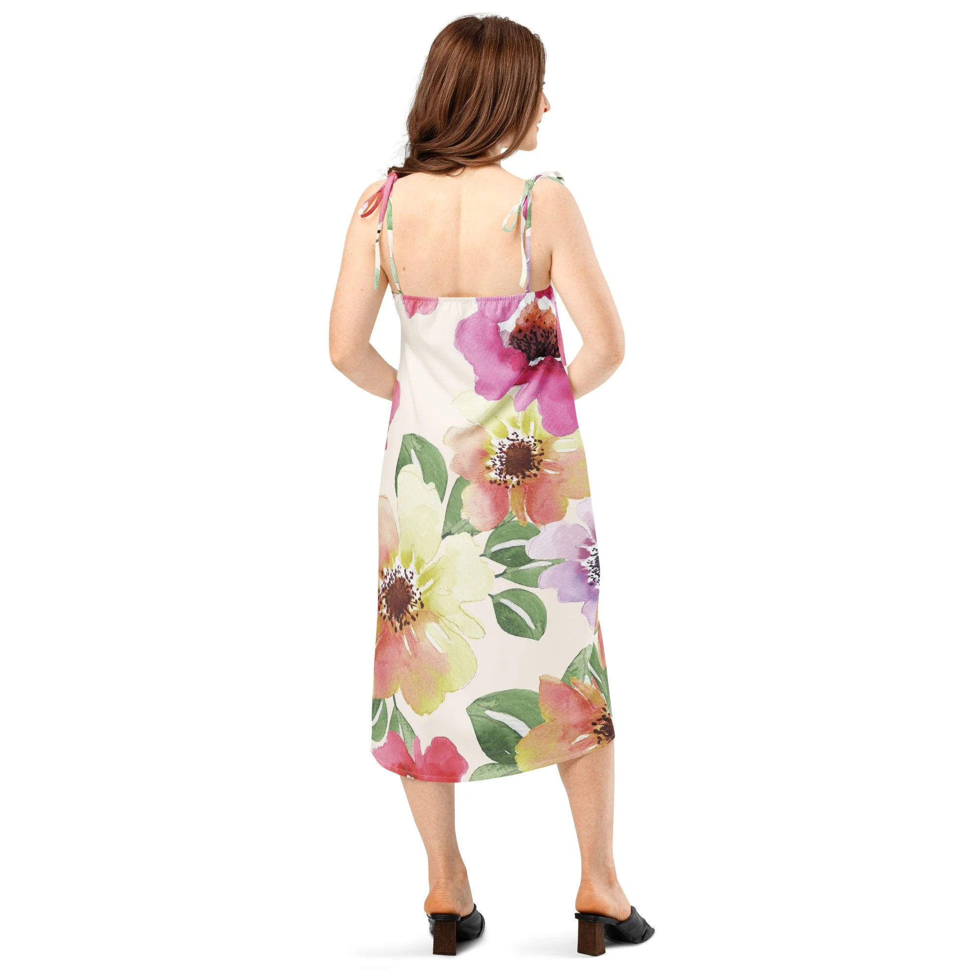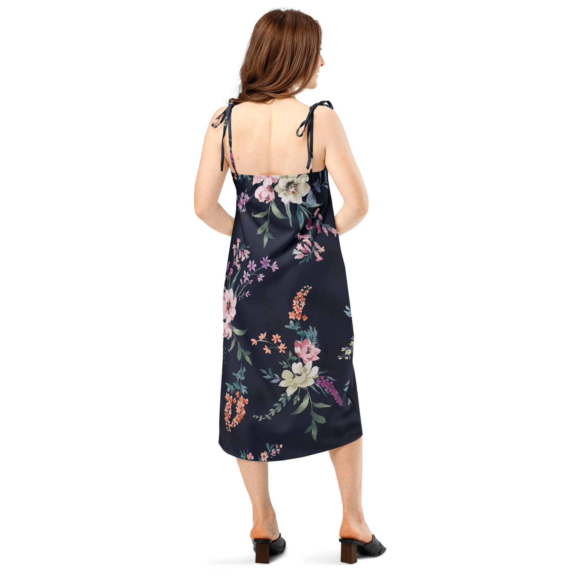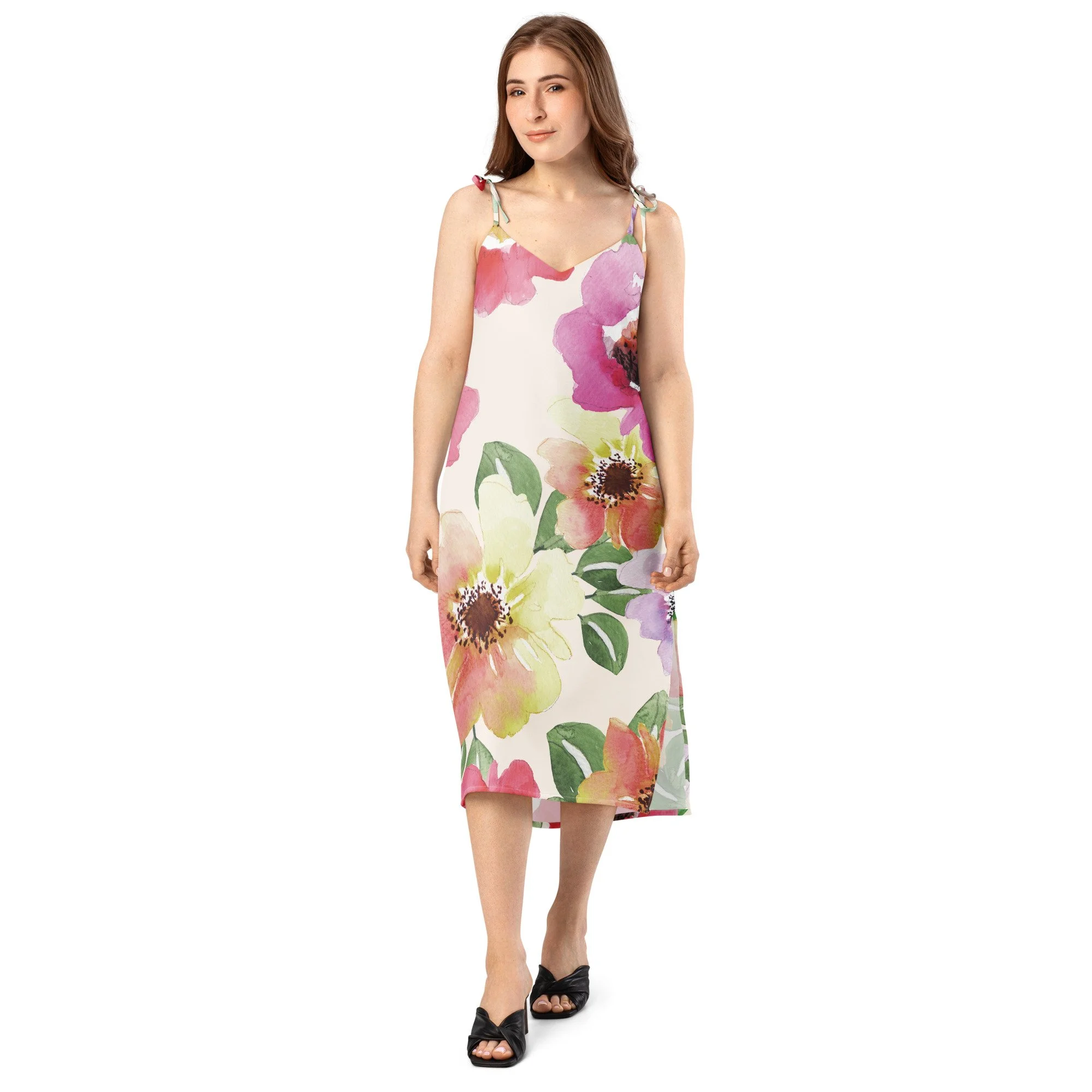Floaty, flirty, and totally flattering—from daytime garden parties to dinner dates. This midi dress features a breezy side slit, adjustable tie straps, and a built-in bra for no-fuss style.